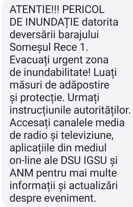 Astfel, a fost luată decizia de a se transmite, preventiv, un mesaj prin sistemul RO-Alert către terminalele mobile, situate într-o arie selectată geometric de-a lungul râului Șomeșul Rece, între localitățile Măguri Răcătău și lacul de acumulare din localitatea Gilău, prin care se solicita populației să ia măsuri de autoevacuare din zonă.
