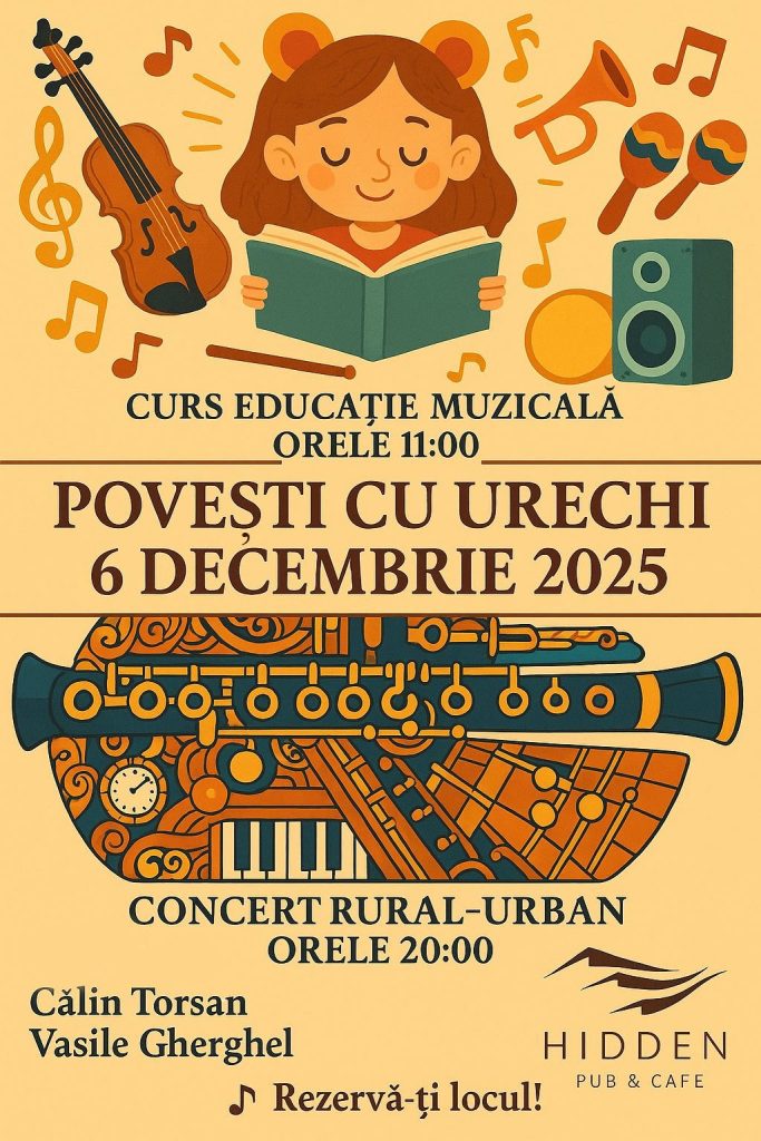 Hidden Pub&Caffe, Dej, str. Avram Iancu nr. 5, județul Cluj, organizează un eveniment dedicat tuturor celor care iubesc muzica și vor să descopere poveștile din spatele ei. Sâmbătă, 6 decembrie 2025, cei de la Hidden vă așteaptă la „Povești cu urechi”, un curs interactiv care îi invită pe participanți într-o incursiune inedită prin lumea instrumentelor, a tradițiilor muzicale și a marilor creații clasice.