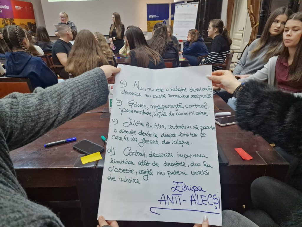 Discuțiile au vizat prevenirea victimizării tinerilor, cu accent pe metoda „Lover Boy”, utilizată pentru racolarea în scopul exploatării sexuale, recunoașterea manipulării și identificarea semnelor unei relații toxice. În cadrul atelierului „Relații toxice versus relații sănătoase”, participanții au analizat diferențele dintre legăturile bazate pe respect și siguranță și cele marcate de control, abuz sau presiune emoțională.