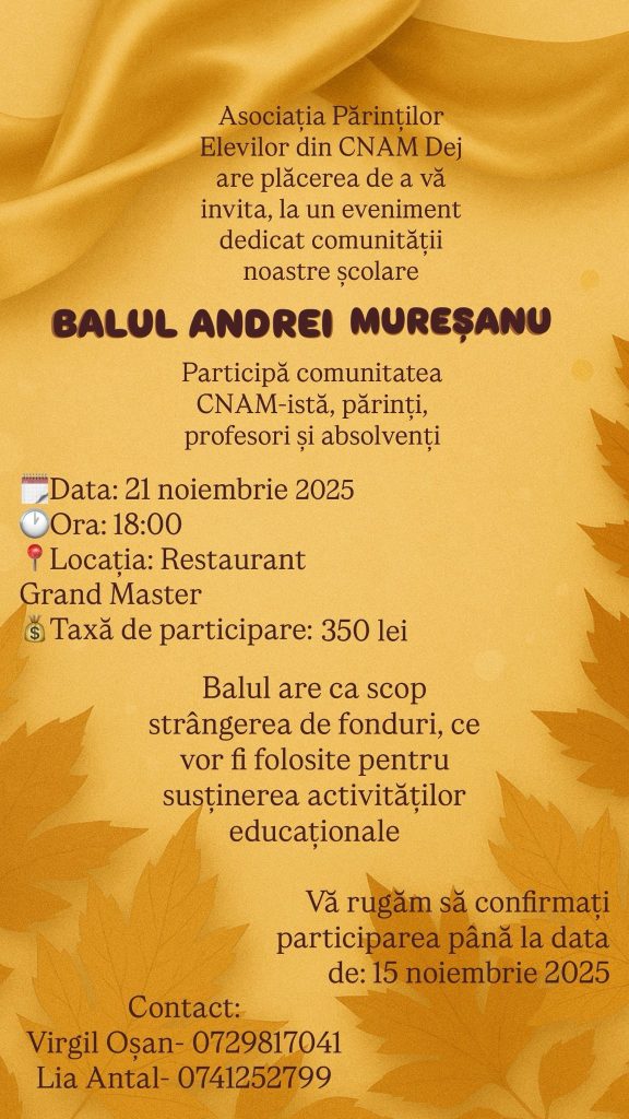 Asociația Părinților Elevilor din CNAM Dej vă invită la un eveniment dedicat comunității școlare a Colegiului Național „Andrei Mureșanu” Dej, județul Cluj. Evenimentul este un prilej de socializare și întâlnire pentru toți absolvenții Colegiului, indiferent de an, și pentru toate cadrele didactice, actuale ori ieșite din activitate. Depănări de amintiri, nostalgii și revederi emoționante pentru toți CNAM-iștii! Dacă faci parte din tradiția CNAM Dej și ești mândru că ai absolvit acest liceu ești invitat vineri, 21 noiembrie 2025, ora 18:00, la Balul „Andrei Mureșanu”, Restaurant Grand Master, Dej!