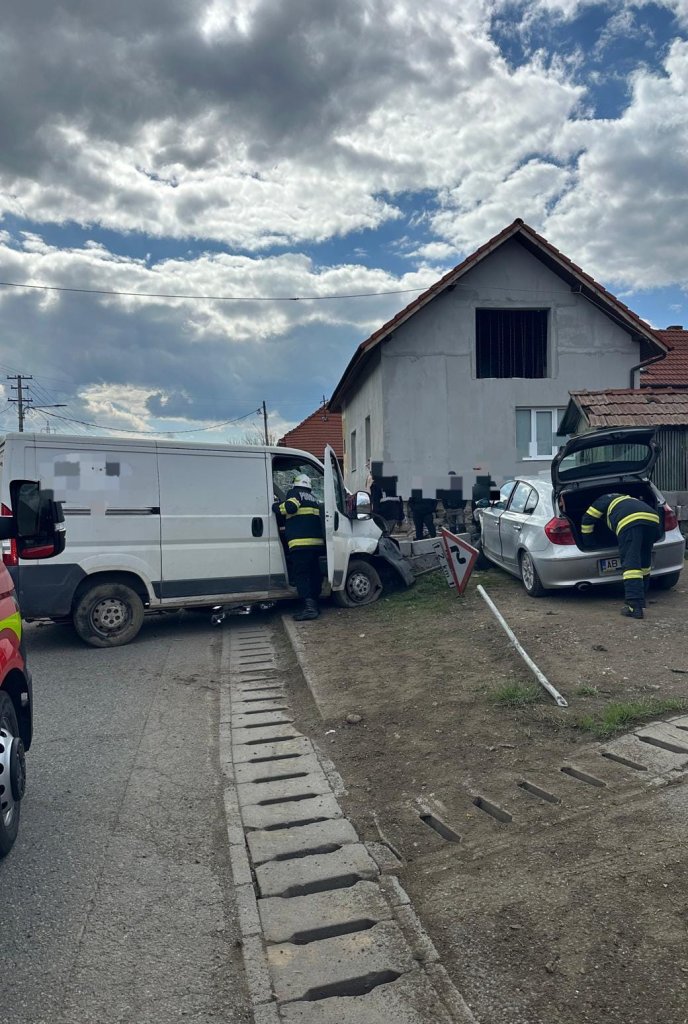 Pompierii din cadrul ISU Alba intervin la un accident produs în localitatea Feneș, unde au fost implicate o autoutilitară și un autoturism.