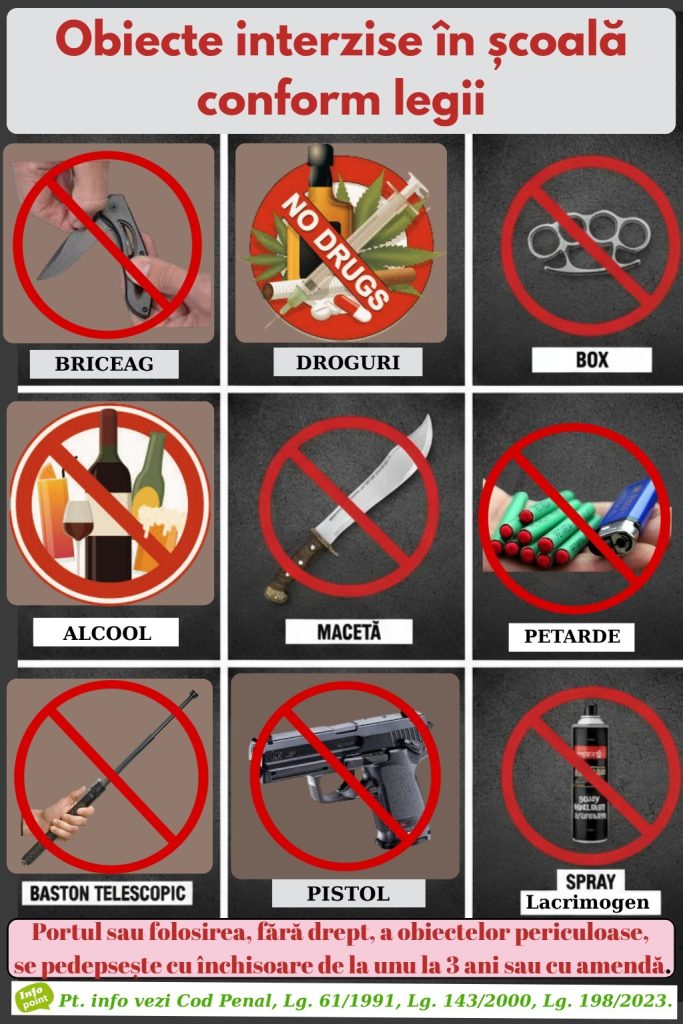 Polițiștii reamintesc faptul că introducerea în unitățile de învățământ a obiectelor care pot pune în pericol siguranța elevilor și a personalului didactic, precum arme, replici de arme, obiecte tăietoare, contondente sau alte bunuri similare este strict interzisă.