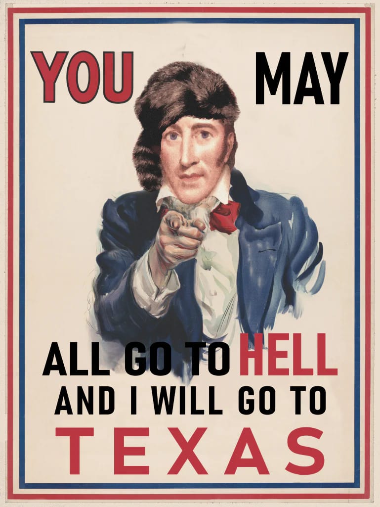 Cel mai bine descrie această stare de spirit un citat al lui David Crockett, unul dintre fondatorii statalității texane. În 1835 Crockett a devenit deziluzionat de politică și a pornit să exploreze Texasul, plecând din Tennessee cu celebrul citat: „Din moment ce ați ales să alegeți un bărbat cu un picior de lemn pentru a-mi succeda, puteți merge cu toții în iad, iar eu voi merge în Texas”. Crockett s-a îndrăgostit de Texas și s-a alăturat voluntarilor în lupta pentru independența Texasului. Este unul dintre citatele mele preferate referitoare la Texas și, din ceea ce observ, probabil că este și al multora din aceasta zonă.