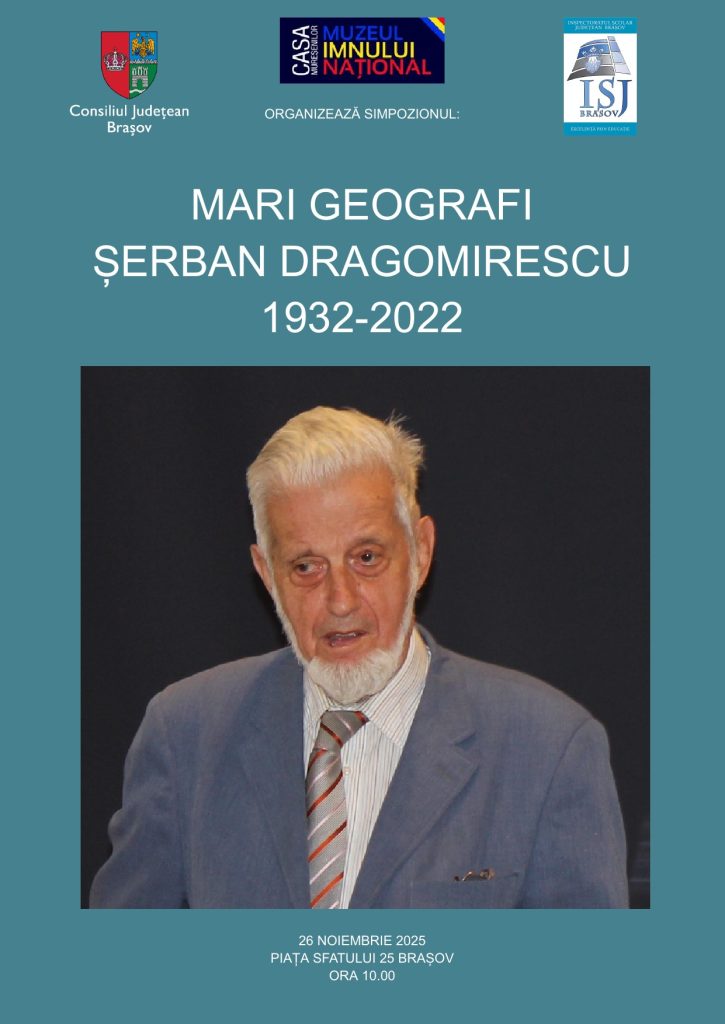 Muzeul Casa Muresenilor Brasov vă invită miercuri, 26 noiembrie 2025, ora 10:00, la simpozionul „Mari geografi”, organizat în parteneriat cu Inspectoratul Școlar al Județului Brașov. Conferința va aduce un omagiu profesorului Șerban Dragomirescu, inițiatorul și organizatorul acestui eveniment în perioada 2006-2019.