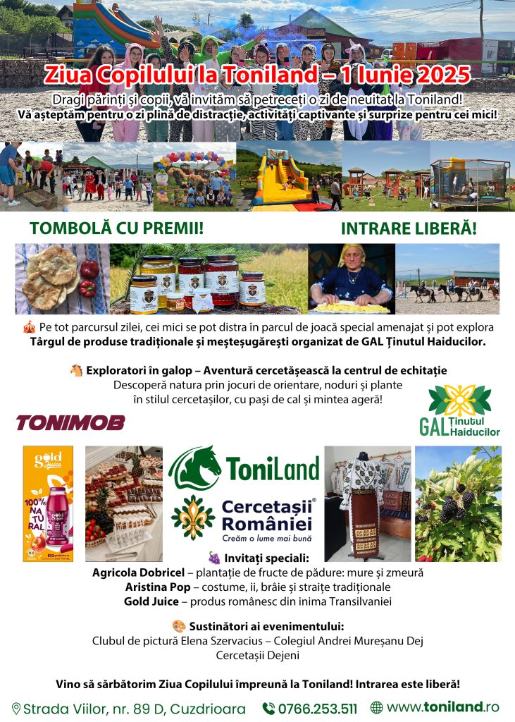 Pe 1 iunie 2025, Toniland devine destinația ideală pentru o zi plină de distracție, magie și aventură dedicată copiilor și părinților deopotrivă. Sub motto-ul „Exploratori în galop”, evenimentul își propune să aducă împreună familii din întreaga zonă, oferind activități captivante într-un cadru natural și prietenos.